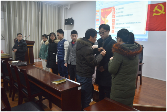 接下来由严老师宣读预备党员行为准则并邀请高书记为新发展预备党员颁放并佩戴党徽。