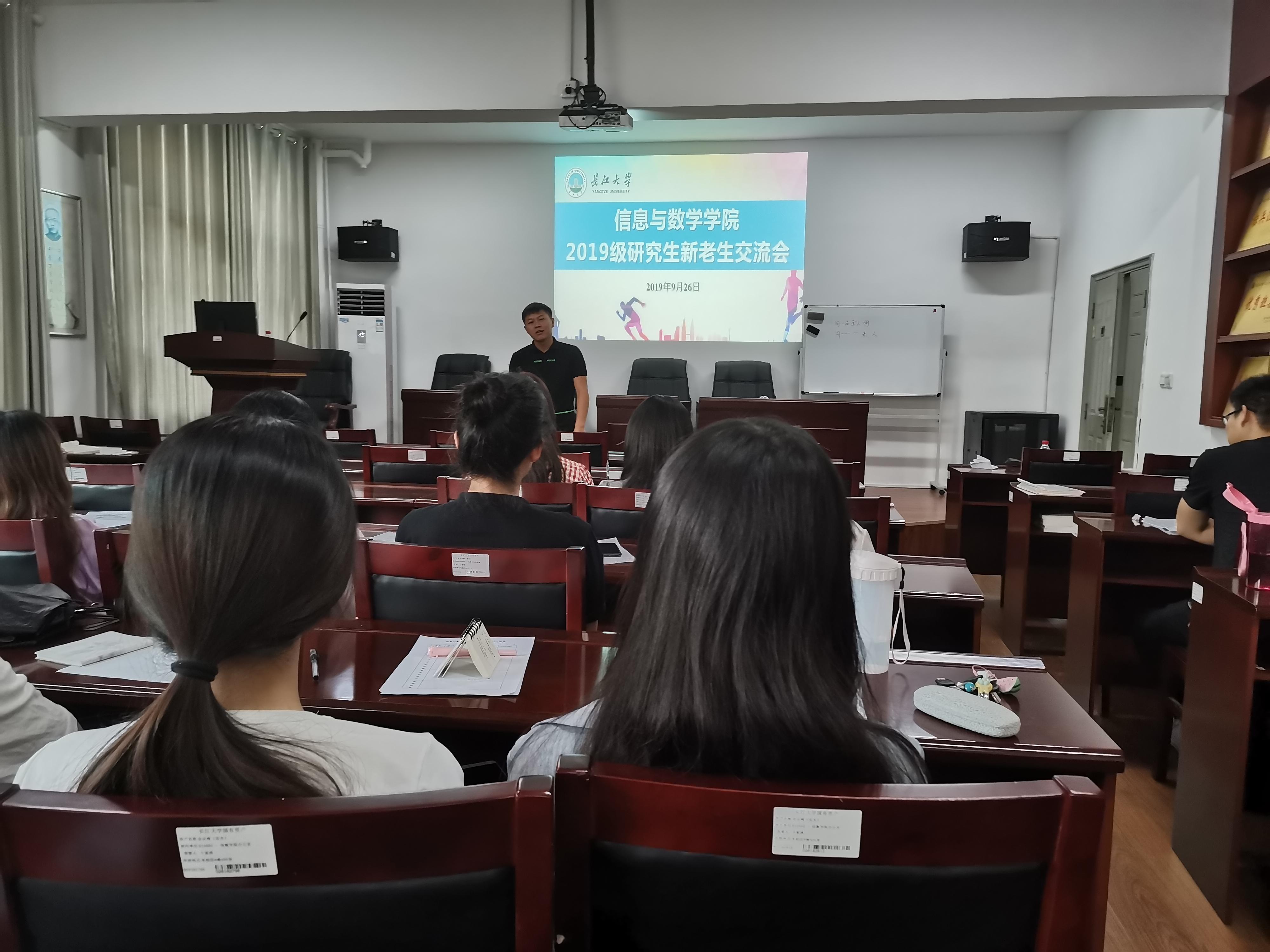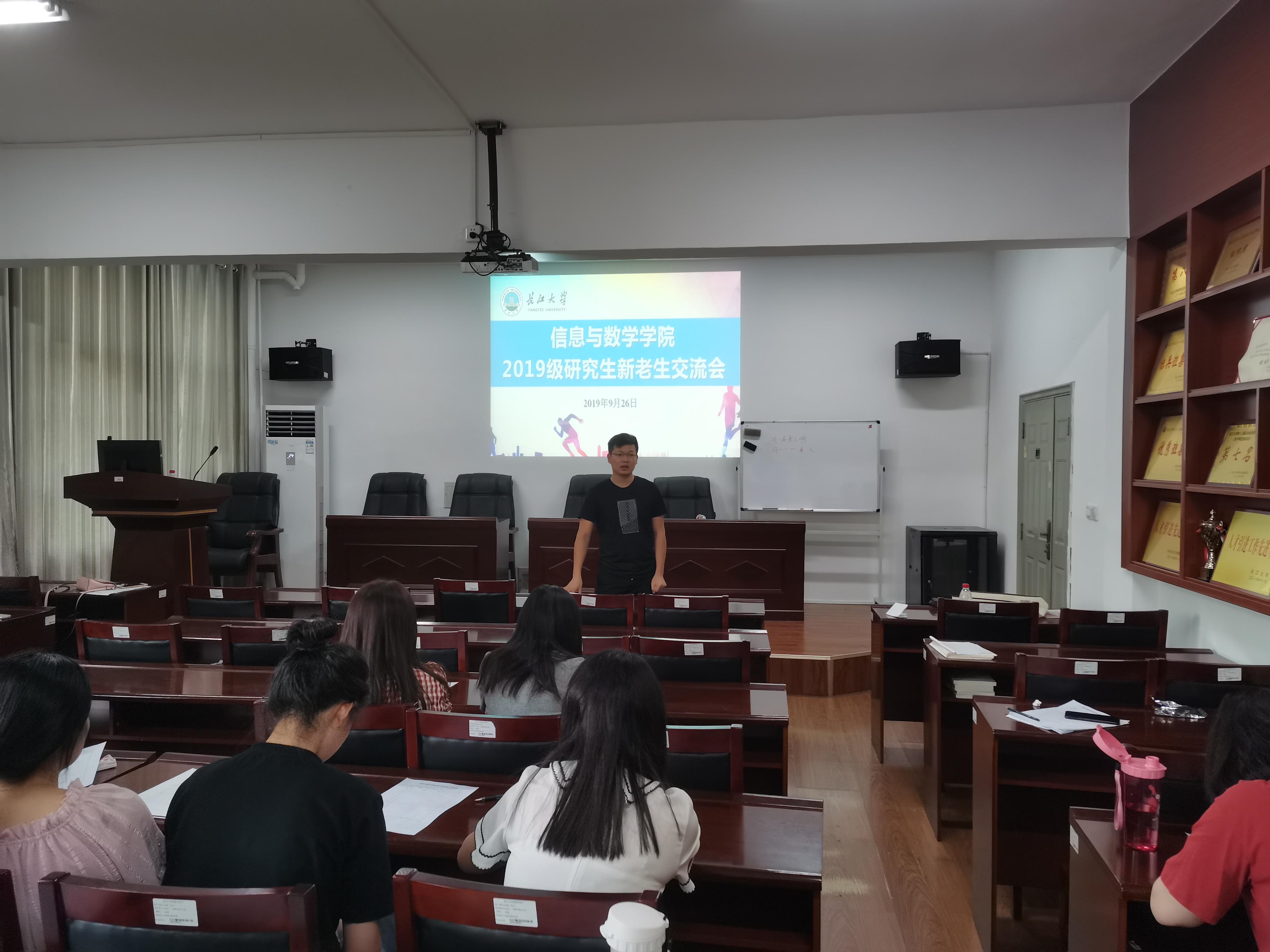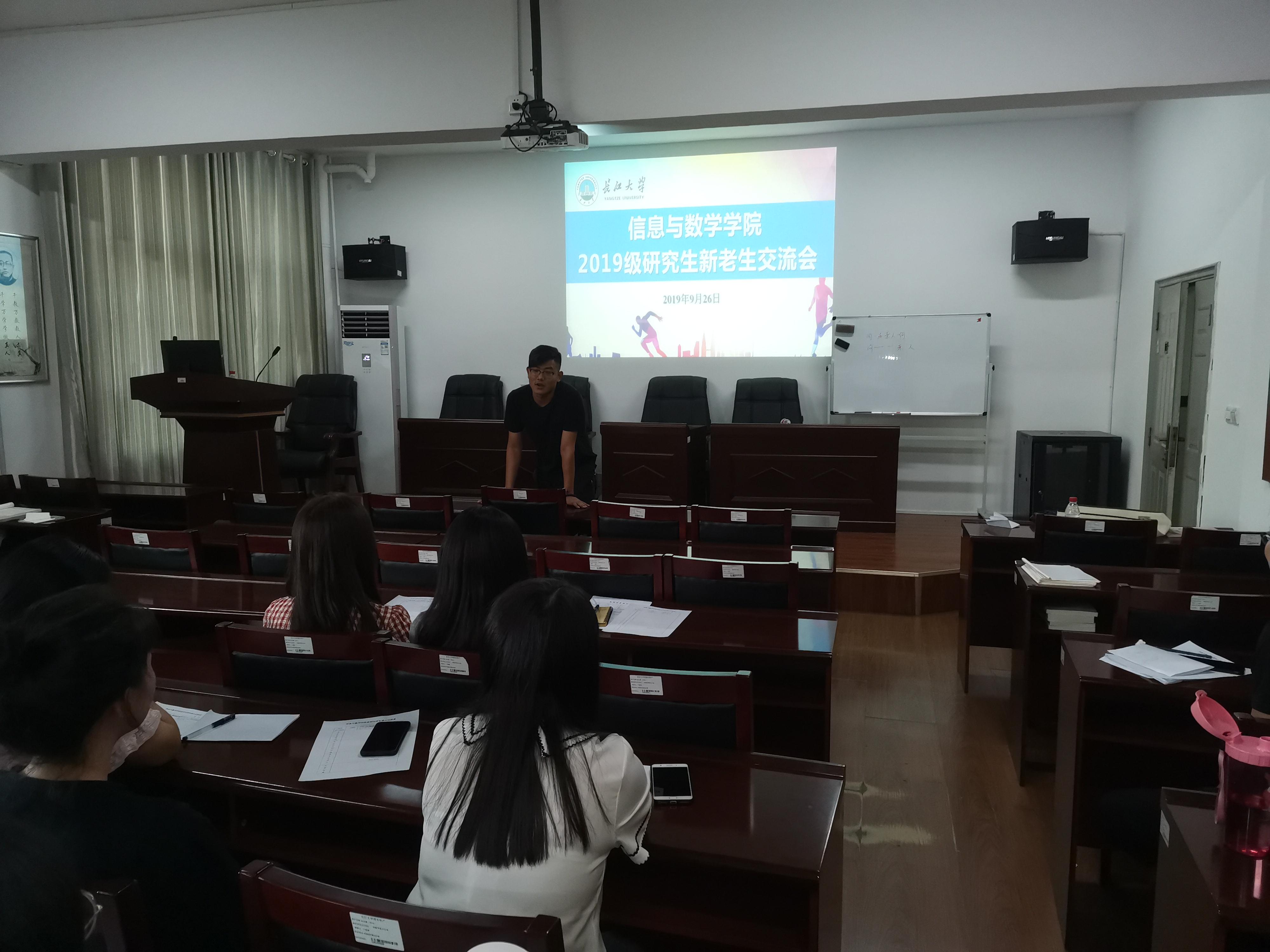 在8教406室顺利召开2019级研究生新老生见面会,2017级研究生代表李政、彭思豪、湛文涛与2019级全体研究生参加见面会。