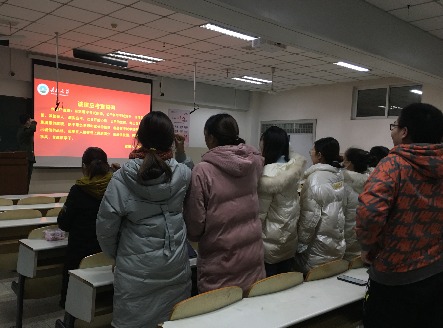 于12月12日晚上七时,七时四十分分别在12教302、402举办诚信考试大会。学工处主任严星以及18、19、20级全体学生参会,院党委副书记袁海山主讲。