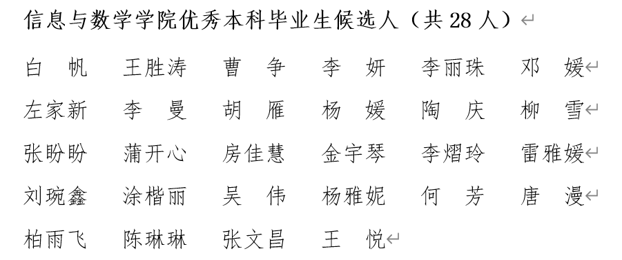 认真组织开展了2022届优秀本科毕业生评选工作,经个人申请、班级推荐、学院审议,讨论决定拟向学校推荐优秀毕业生28名,现予以公示。