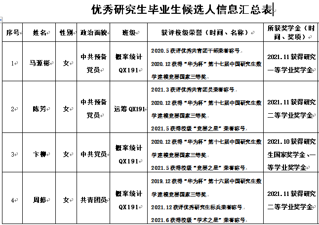 根据学校《关于开展2022届优秀研究生毕业生评选工作的通知》要求,黄色网址大全 认真组织开展了2022届优秀研究生毕业生评选工作,经个人申请、班级推荐、学院审议,讨论决定拟向学校推荐优秀研究生毕业生4名,现予以公示。