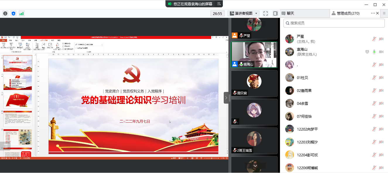 22级全体本科、研究生新生在腾讯会议上了一堂生动的党课。本次课程由学院党委副书记袁海山主讲。