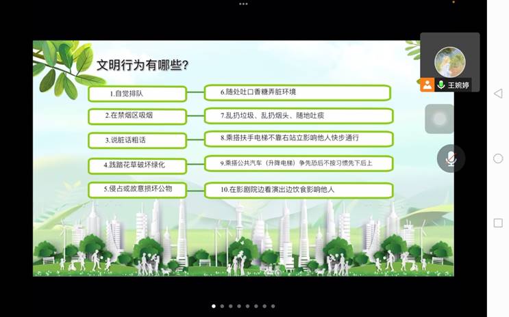 针对第二个问题,王婉婷向同学们介绍了哪些是文明行为,哪些是不文明行为。紧接着针对第三个问题她向同学们介绍并提出希望同学们做到以下四点“遵守公共规则”、“文明礼仪”、“文明行为”、“热心公益活动”。通过她的讲解同学们纷纷表示这不仅是为了荆州市创文工作做贡献,更是社会对我们青年的期望,