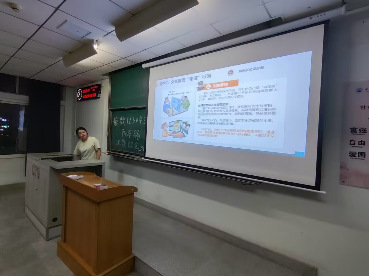 在班会上,班长结合常见典型诈骗案件,揭露各类电信诈骗犯罪活动的新变化,新特点,提醒班级同学在网上观看视频,购物,交友时要提高防范意识,谨防上当受骗,同时班主任对常见的网络兼职刷单诈骗,网络游戏产品虚假交易诈骗,“杀猪盘”诈骗等诈骗方式进行了详细的讲解,并通过鲜活的案例,让同学们意识到电信诈骗,离我们并不远。随后班长就如何识别防范电信诈骗这一方面进行了详细的说明,并教授了同学们“防电信诈骗十守则”与“预防电信诈骗五不要”,通过顺口溜的形式,让同学们更加接受这些预防守则,最后班主任提醒同学们在日常生活中要保护好个人隐私,不要随便泄露网络账户,银行卡等信息,避免给诈骗犯罪分子可乘之机,同时叮嘱同学们及时下载“国家反诈中心”APP,进一步筑牢反诈骗“防火墙”,全面做到防诈反诈进校园。