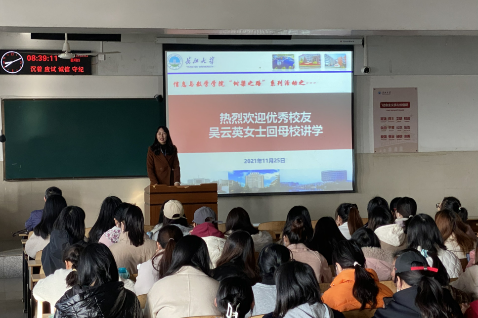 2001级优秀校友吴云英女士为我们做了报告。她详细的介绍了她个人的成长经历,吴云英女士本硕皆就读于黄色网址大全