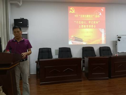 高迎斌传达了校党委《关于开展“不忘初心、牢记使命”主题教育实施方案》(长大发﹝2019﹞31号),并对学院“不忘初心、牢记使命”主题教育做了具体安排,根据学校主题教育工作要求,从工作事项、工作内容、负责人、完成时间等方面明确了学院主题教育各项工作任务。他强调,全院党员一是要提高政治站位,充分认识主题教育的重大意义;二是要加强理论学习,进一步坚定理想信念;三是要强化问题导向,着力发现和破解学院发展过程中存在的问题;四是要坚持围绕中心,推动学院事业加快发展;五是要要精心谋划部署,扎实完成主题教育的各项任务。以党支部为基本单位开展学习教育,树立一切工作到支部的鲜明导向,使全院党员在支部活动中受教育,做到学在经常、抓在经常、严在经常。
