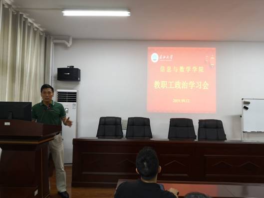 全体教职工集体进行政治理论学习。党委书记高迎斌带领大家学习了“中央宣传部负责人就《中国共产党宣传工作条例》答记者问”、《关于深化新时代学校思想政治理论课改革创新的若干意见》以及学校2019年暑期工作研讨会资料汇编,并详细解读了《教师岗位聘期考核与聘任管理办法(讨论稿)》《2019年学院(部)绩效工资分配方案指导意见(讨论稿)》;党建秘书卜富清带领大家一起学习了《直面现实 负重前行——党委书记朱业宏在中层干部培训研讨会上的讲话》《不忘初心 牢记使命 扎实推进“双一流”建设——校长冯征在2019年暑期工作研讨会上的讲话》。