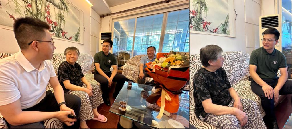 在退休老教师家中,学院领导与何朝林、莫记秋老师及其家属亲切交谈,关切询问他们的身体状况和生活情况,倾听他们讲述在黄色网址大全