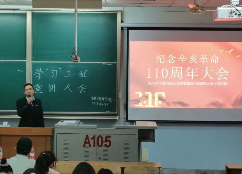 在此次会议中,袁书记从孙中山先生开始讲述,到数位革命英雄的英勇事迹,再到辛亥革命时期的革命起义,让革命的历史再次浮现。会议伊始,袁书记就提起革命先驱孙中山先生,他在中华民族的历史进程中有着举足轻重的地位。国庆期间的阅兵仪式中,孙中山先生的巨幅画像在天安门高高竖起,年复一年,同毛主席的画像一起注视着这百年后的盛世。紧接着又讲述起辛亥革命前前后后的原因及结果,国家支离破碎,民族走向灭亡,帝国主义列强们肆无忌惮的蚕食着中国的领土。东方的雄狮正缓缓睁开眼眸,即将苏醒。家国存亡之际,一位位有志之士纷纷起身,共挽天倾。其中不乏家境优渥之人,不乏寻常人家,有热血好儿郎,也有不输须眉的巾帼们。革命女英雄秋瑾慷慨就义,为千千万万的家庭舍弃了自己的家庭。无数烈士抛洒的鲜血化作火焰在神州大地上蔓延,生生不息。从安徽和浙江的起义,到安庆革命起义,再到镇南关起义,到广州起义。孙中山先生和众多爱国华侨在大洋彼岸心系着祖国,纷纷援助,为民族解放的伟业奔波效劳。袁书记讲述起义中英雄们前赴后继,献出宝贵的生命。旨在让众多学子明白,这些刻骨铭心的民族记忆,中华儿女永不能忘。革命的红色火焰要一直留存在每个人的心底,薪火相传。会议所讲的辛亥革命,告诫着每一位中华儿女勿忘国耻,为国为民,要提升自己能力,投身于祖国发展建设。革命先辈的精神永远留存在心底。