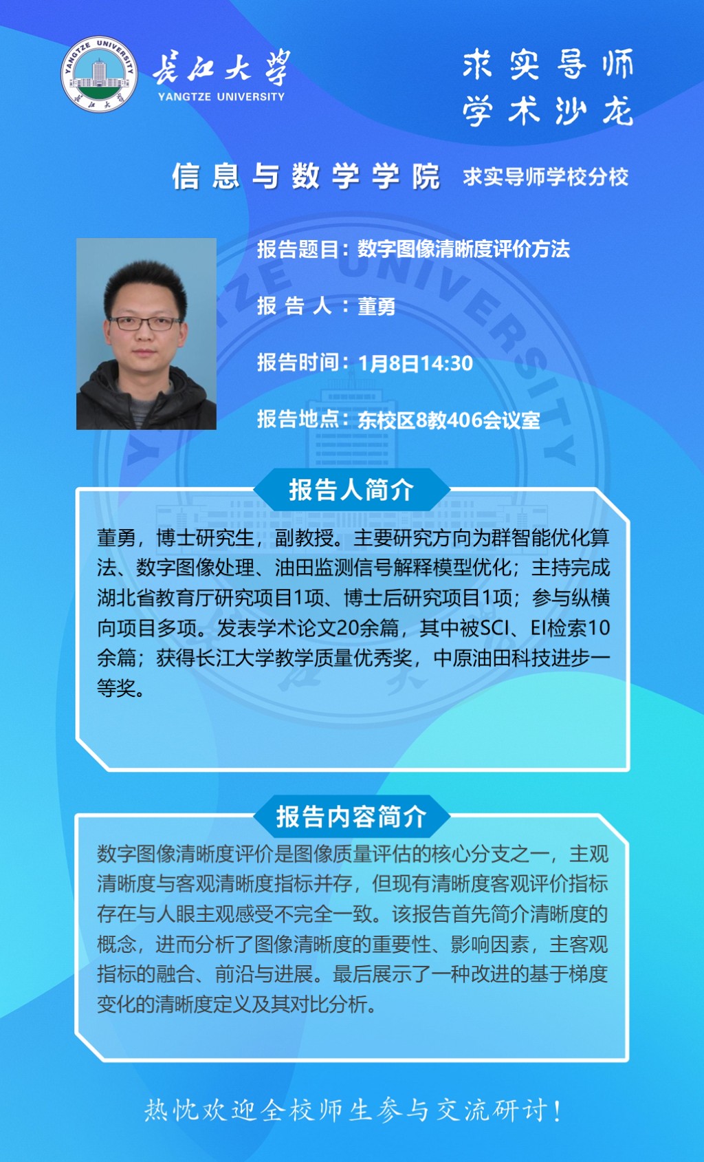 报告人 董勇 副教授 报告时间 2026年1月8日14:30
