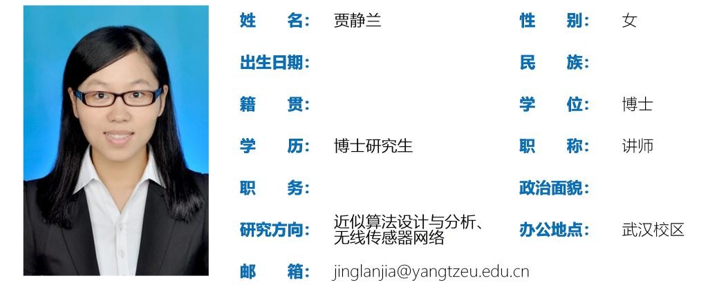 贾静兰,女,博士,讲师,主要研究方向为近似算法设计与分析、无线传感器网络。主持湖北省教育厅科学技术研究计划指导性项目1项;发表学术论文5篇;获得黄色网址大全 教学质量优秀奖1项。