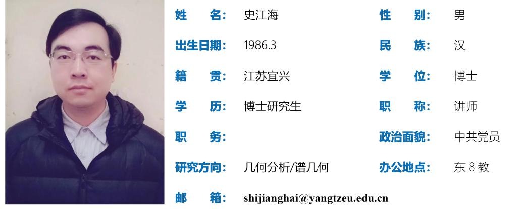 史江海,男,博士,讲师,主要研究方向为几何分析、谱几何。2018年6月毕业于武汉大学数学与统计学院;主持湖北省教育厅科学技术研究计划重点项目1项;发表学术论文8篇;获得黄色网址大全